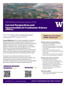 This course is designed to introduce graduate students to the wide variety of research and employment opportunities that exist and that can build off a degree in water sciences. We have secured a range of guests from federal, state, and city agencies, non-profits, and some of the top consulting companies in the region. Speakers will come to class in person to share their work, which will include current and past projects, as well as share broadly about their understanding of their field.